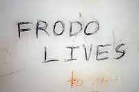 "Frodo Lives!" was a popular counterculture slogan in the 1960s and 1970s, referring to the character Frodo Baggins from J. R. R. Tolkien's fantasy novel The Lord of the Rings, commonly associated with the hippie movement.