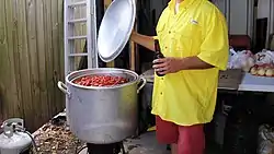 A boil is usually done in a large pot (60 to 80 quarts — large enough to necessitate a truck in most cases) fitted with a strainer and heated by propane. However, some traditionalists see no need for a strainer and make use of a net or a wire mesh scoop. Seasonings include crab boil packets, cayenne pepper, hot sauce, salt, lemons, and bay leaf. Ears of corn, new potatoes, onions, and heads of garlic are usually included in shrimp and crawfish boils. Some people will add smoked sausage links or mushrooms. When cooking crawfish there is a debate over whether or not the crawfish must first be purged by covering them with clear water and a generous amount of salt for a few minutes. Advocates argue that this forces the crawfish to rid their bodies of impurities. Others argue that it does not work and is an unnecessary step. A "Boil Master" is in charge of making sure the ingredients go into the pot in the proper sequence and controls the timing of the steps. There is no right or wrong when seasoning a crawfish boil and many experienced boilers simply go by feel although there are some guidelines to follow and a great deal of opinions on how a boiled crawfish should be seasoned.[2] Many recipes call for a short boil followed by a period of soaking with the heat turned off. The contents of the pot are removed, drained, and then dumped onto a newspaper covered table. Sometimes, crawfish may be dumped into the traditional watercraft in which crawfishermen have historically used to traverse the bayous and swamps; a pirogue. Bottles of hot sauce, lemons and melted butter are usually available, along with cocktail sauce at a shrimp boil. Some families like to use Italian salad dressing or ketchup, or a mixture of both.