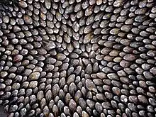 The Charente-Maritime département of France, on the Bay of Biscay, is noted for the abundance of mussels.[13] The Éclade des Moules (or, locally, Terré de Moules) is a bake often held on the beaches outside of La Rochelle. The mussels are arranged in concentric circles on a plank so that the hinged part of the shell is facing up. Pine needles are mounded on top to a depth of a foot or so and set afire. The needles burn down quickly, producing a rich resinous smoke. Two or three minutes after the fire goes out, the ashes are swept away and the mussels are eaten directly from the shell along with country bread, butter, and white wine.