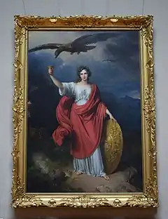 The painting shows a young goddess wearing a white chiton and a purple cloak; there is a laurel wreath on her head. In her right hand she is holding up a gold cup, her other hand is resting on a large shield. The goddess is set in a dark landscape, where heavy clouds are gathering on the sky, but the first rays of the light are bursting through the gloom. Two eagles are coming, the first one is approaching the gold cup.