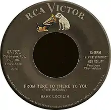 "From Here to There to You" was released as a single in April 1961 on RCA Victor Records.[4] The single was released as a seven-inch RPM record, containing "From Here to There to You" as the A-side and "This Song Is Just for You" as the B-side.[5] The song spent a total of seven weeks on the Billboard Hot Country and Western Sides chart, peaking at number 12 in June 1961.[6] It was later released on Locklin's 1962 studio album, also titled Hank Locklin.[1]