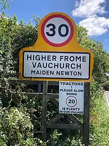 Frome Vauchurch is a parish in the county of Dorset in southern England, situated approximately 7 miles (11 km) northwest of the county town Dorchester. It includes the hamlets of Frome Vauchurch, Higher Frome Vauchurch, Lower Frome Vauchurch and Tollerford. Frome Vauchurch is sited in the Frome valley amongst the chalk hills of the Dorset Downs. The parish is adjacent to the village of Maiden Newton, with which the parish's hamlets are virtually contiguous. Dorset County Council's latest (2013) estimate of the parish population is 160.[1]