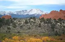 The Front Range runs north-south between Casper, Wyoming, and Pueblo, Colorado, and rises nearly 10,000 feet above the Great Plains. Longs Peak, Mount Evans, and Pikes Peak are its most prominent peaks, visible from the Interstate 25 corridor. The area is a popular destination for mountain biking, hiking, climbing, and camping during the warmer months and for skiing and snowboarding during winter. Millions of years ago, the present-day Front Range was home to ancient mountain ranges, deserts, beaches, and even oceans.[2]
