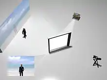 Front projection—the background is projected onto a two-way mirror, which reflects the image onto a highly reflective surface