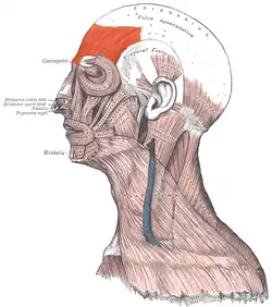 The frontalis muscle (from Latin 'frontal muscle') is a muscle which covers parts of the forehead of the skull. Some sources consider the frontalis muscle to be a distinct muscle. However, Terminologia Anatomica currently classifies it as part of the occipitofrontalis muscle along with the occipitalis muscle.[2]