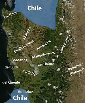 The southern indigenous frontier of the Viceroyalty of the Río de la Plata was the southern limit into which the viceyolty could exert its rule. Beyond this lay territories[10] de facto controlled by indigenous peoples who inhabited the Pampas and Patagonia. These group were mainly the Tehuelche, Pehuenche, Mapuche,[11] and the Ranqueles.