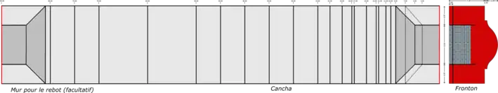 The lower zone line is 15 cm wide and the height depends on the size of the fronton (see chart). The upper zone is frequently marked at 10 m high on the wall and the line is also 15 cm wide.
