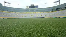 The underground heating and drainage system was redone in 1997, with a system of pipes filled with a solution including antifreeze replacing the electric coils. After the 2006 season, the surface, heating, and drainage system was replaced. From 2007 until 2018, the playing surface used the Desso GrassMaster system, which has synthetic fibers woven into the traditional Kentucky bluegrass sod.[62][63][64] In 2018, the Grassmaster surface was replaced with polyethylene-based SIS Grass.[6] Even the new video boards, installed in 2004, have been influenced by the field's nickname, being called "Tundra Vision". These video displays measure more than 25 feet (7.6 m) high by 46 feet (14 m) wide.[65] An artificial lighting system, based on technology used in Dutch rose-growing greenhouses, was tested in 2010 and purchased for use in the 2011 season. It operates 24 hours a day from October to early December to extend the growing season for the field's grass. The system is also used in some soccer stadiums where shade from stands and partial roofs are a problem for the turf, not the cold and short growing season found in Green Bay.[61]