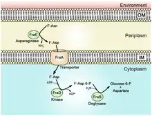fraA encodes a transporter of the Dcu family, which moves F-Asp, but not F-Asn, into the cytoplasm.[5]