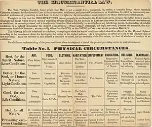 Many of Alcott's and Lane's ideas were derived from Transcendentalism. They were influenced by the Transcendental ideas of God not as the traditional view from the Bible but as a world spirit.[10] Alcott's view of Transcendentalism was a sort of religious anarchism, a renunciation of the world to focus on the spirit.[11] The members of Fruitlands believed that spiritual regeneration was linked to physical health, that "outward abstinence is a sign of inward fullness".[12] Though it was based on working together as a community, Fruitlands also hoped for individualistic improvement.[10] Alcott also believed in the perfect intuition of children and, therefore, put a strong emphasis on education and hoped that their innocence would have a rejuvenating effect on elders.[13]