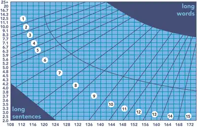 The grade reading level (or reading difficulty level) is calculated by the average number of sentences (y-axis) and syllables (x-axis) per hundred words. These averages are plotted onto a specific graph; the intersection of the average number of sentences and the average number of syllables determines the reading level of the content.