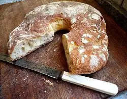 Ftira is a ring-shaped, leavened, Maltese bread, usually eaten with fillings such as sardines, tuna, potato, fresh tomato, onion, capers and olives.[1] Regional variations include Gozo ftira, which is served more like a pizza than a sandwich. Gozitan ftira is served open with thinly sliced potato over the crust, or folded over like a calzone.[2]