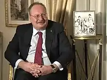 Farouk would visit Fuad two or three times each year before the former's unexpected death, possibly from a heart attack, in 1965, when Fuad was 13 years-old. Fuad believes that Farouk was "poisoned by enemies".[18] When he died, there were rumours in the press that he had been poisoned by Egyptian intelligence, though there is no known evidence to confirm this.[19] After Farouk's death, Fuad was guaranteed protection by Prince Rainier III of Monaco and his wife Princess Grace. Fuad would later become friends with Rainier in his early adulthood, when he visited Monte Carlo every summer.[10] He has a Monégasque passport, on which he is named His Royal Highness Prince Ahmed Fouad Farouk.[18][10]