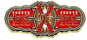 Fuente Fuente OpusX is the premier cigar line in the Arturo Fuente Cigar family.[1][2] Made by Tabacalera A. Fuente, this cigar is consistently ranked as the single most sought-after cigar in the world by Cigar Aficionado and the line is held by many to be the greatest cigar in history to date. The cigars are rare and can be difficult to obtain. Prized by collectors, many OpusX's sell for 300% or more of their suggested retail price on the secondary market. Fuente Fuente OpusX cigars are wrapped in tobacco leaves which are grown at the Chateau de la Fuente plantation in a tropic river valley in the Dominican Republic.