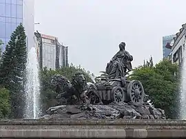 The Fountain of Cybele (Spanish: Fuente de Cibeles) in Mexico City is a bronze replica of the fountain located in the Plaza de Cibeles in Madrid that was built during the reign of Charles III by architect Ventura Rodríguez between 1777 and 1792. The Mexican version is located at a traffic circle in Plaza Villa de Madrid, where Oaxaca, Durango, Medellín and El Oro streets converge in Colonia Roma.