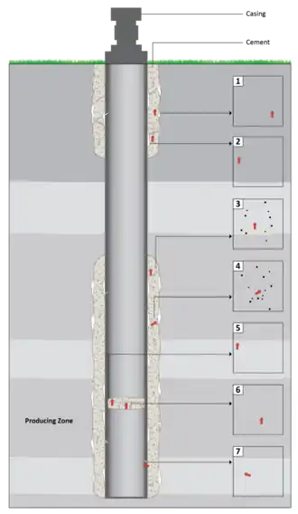 Sources can include broken or leaky well casings (either at abandoned wells or unused, but not properly abandoned, wells) or lateral migration through the geological formations in the subsurface before being emitted to groundwater or atmosphere.[1] Broken or leaky well casings are often the result of geochemically unstable or brittle cement.[3] One researcher proposes 7 main paths for gas migration and surface casing vent flow: (1) between the cement and adjacent rock formation, (2) between the casing and encompassing cement, (3) between the casing and the cement plug, (4) directly through the cement plug, (5) through the cement between casing and adjacent rock formation, (6) through the cement between linking cavities from the casing side of the cement to the annulus side of the cement, and (7) through shears in the casing or well bore.[4]