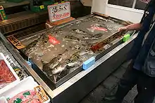 In the cuisine of Hakusan, Ishikawa, ovaries are served after effort is made to reduce the toxin level by salting and pickling for three years—e.g., in "Blowfish Ovaries Pickled in Rice-Bran Paste" (河豚の卵巣の糠漬け, ふぐのらんそうのぬかづけ).[44] Only the "Mikawa district of Hakusan City, the Ono and Kanaiwa districts of Kanazawa City, and Wajima City, all in Ishikawa Prefecture" are permitted to perform the process, and only by the traditional method, and explicit warnings are offered to dissuade non-professionals from attempting the 3-year process.[44][45] After one year of pickling—about a third of the way through the process—about 10% of the toxin is suggested to remain,[46] and after the full three years the product is "only sold after having been checked for safety through a toxicity inspection, and other tests."[45]