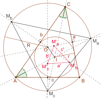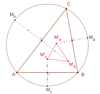For a given triangle and its circumcircle the midpoints of the arcs over triangle sides are denoted by . Those midpoints get reflected at the associated triangle sides yielding the points , which forms the Fuhrmann triangle.[1][2]