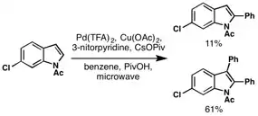 Fagnou's group showed that direct C-H arylation of an indole is possible using palladium catalysis with a copper oxidant.[14] Although the reaction requires high temperature, acidic solvent, and solvent quantities of the coupling partner, this demonstration of a selective and direct hetero aryl-aryl coupling is notable.