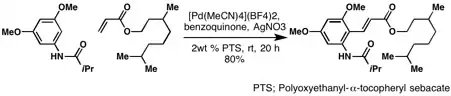 The Lipshutz group dramatically improved the conditions of the Fujiwara–Moritani reaction by developing reaction conditions that utilize water as the solvent and obviate the need for an exogenous acid.[17] Although the substrate scope is limited to p-methoxy aryl species, Lipshutz's report suggested that the Fujiwra-Moritani can be run under milder conditions.