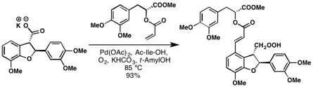The Yu group developed an Aryl C-H olefination reaction in which aryl carboxylic acids were directly coupled to olefins through the aryl C-H bond. Note: this is not the Fujiwara–Moritani reaction because it is directed by the free acid. The Fujiwara–Moritani reaction is typified by non-directed C–H palladation consistent with regioselectivity of Friedel-Crafts reactions. [15] They also applied their methodology for the total synthesis of (+)-Lithospermic acid.[16] It is worth noting that the product yield is as high as 93% despite the complexity of both coupling partners. This is the one of the best examples in which C-H olefination simplifies the retro synthesis and demonstrates a convergent synthesis of this complex natural product.