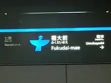 Fukudaimae Station (福大前駅) is a subway station on the Fukuoka City Subway Nanakuma Line in Jōnan-ku, Fukuoka in Japan. Its station symbol is a picture of a black kite in blue, the symbol of the Fukuoka University.