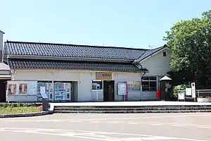 The station has a two opposed ground-level side platforms serving one two tracks, connected to the wooden station building by a wooden footbridge. The station has a Midori no Madoguchi staffed ticket office.