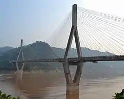 The Fuling Yangtze River Bridge is a cable-stayed bridge over the Yangtze River in Fuling District of Chongqing, China. Completed in 1997, it was the first bridge over the Yangtze in the Fuling district. The bridge carries four lanes of the China National Highway 319 and is 631 metres (2,070 ft) long including a main span of 330 metres (1,080 ft).[1]