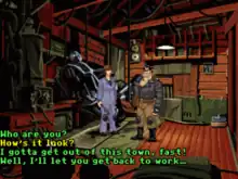 Full Throttle is a single-player video game in which the player controls the actions of the player character from a third-person perspective using a point and click interface. Players can move the player character to any place on the scene, interact with objects that are highlighted by the cursor, or leave scenes via exits - either on foot for most scenes, or via the character's motorbike, both types denoted by their own icon. As with other LucasArts graphic adventure games of the era, dialogue plays a large part in the game, presenting story elements and information necessary to advance, as well as fleshing out the characters. During conversations with other characters, several choices of dialogue are presented. The currently selected choice is highlighted, and once clicked, the player character responds with the selected choice. Choosing the correct response allows the player to advance the conversation and ultimately advance the scene.[2]