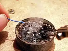 A fume extractor is a device used to filter aerosolized chemical byproducts of the soldering process.[1] These devices take many forms depending on the project size and application, from small ductwork to entire fume hoods.[2] Solder itself, which is generally composed of low melting temperature metals and adjunctives, as well as the various components used during the act of soldering, including flux, rosin,[3] and the various coatings found on solderable materials, like Polytetrafluoroethylene together present a substantial occupational health hazard.[2] The goal of a fume extractor is to move these environmental pollutants away from the user and other occupants of the room as quickly and efficaciously as possible so as to stay within the safe exposure limits of the various substances present, and reduce the risk of adverse health outcomes like metal fume fever, polymer fume fever, occupational asthma, and allergic reaction.[2]