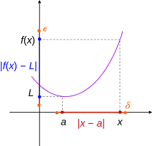 The limit of a real-valued function of a real variable is as follows.[1] Let a be a point in topological closure of the domain X of the function f. The function, f has a limit L when x tends toward a, denoted