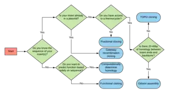 Gibson assembly is a quick cloning method that uses three primary enzymes; 5' exonuclease, polymerase and ligase.[15] The exonuclease digests the 5' end of DNA fragments leaving a 3' overhang.[15] If there is significant homology (20-40 bp) on each end of the DNA insert, it can anneal with a complementary backbone.[15] Afterwards the polymerase can fill in the gaps while ligase fuses the nicks at the end.[15] This method greatly increases the rate of cloning and success rate of cloning into a vector backbone.[15] However, it requires the DNA fragment to have significant homology with the plasmid.[15] For this reason, knowledge of the sequence being cloned must be known beforehand. This is not a requirement with functional cloning.