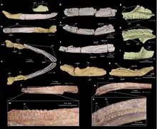 The identity of Funcusvermis as a gymnophionan amphibian is supported by a range of traits, including a long additional tooth row in the jaw, a fused maxillopalatine bone in the skull, and a modified jaw with a pseudodentary and pseudoangular. Small femora (thigh bones) indicate that legs were still present in Funcusvermis, despite its modern relatives being completely legless. Funcusvermis is the oldest known gymnophionan, and has the largest known sample of fossils referred to the group.[1] Previously, both records were held by Eocaecilia micropodia, an amphibian from the Early Jurassic Kayenta Formation of Arizona.[3]
