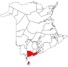 ![]() The riding of Fundy-The Isles-Saint John West (as it exists from 2014) in relation to other New Brunswick electoral districts. | |||