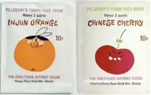 The product name "Funny Face" was based on the packaging and advertising created by Hal Silverman of the Campbell Mithun advertising agency.[7][8] Each flavor was designated by a cartoon character with a presumably amusing face. The original flavors, and their names, were Goofy Grape, Rootin'-Tootin' Raspberry, Freckle Face Strawberry, Loud-Mouth Lime, Injun Orange, and Chinese Cherry. These last two, being ethnic stereotypes considered offensive by that time, were soon revamped to Jolly Olly Orange and Choo Choo Cherry, respectively. [5][6] Additional flavors were added later, including Lefty Lemon (later called Lefty Lemon-Lime and Lefty Lemonade), Captain Black Cherry, Chilly Cherry Cola, Loud-Mouth Punch (who was a re-working of the Loud-Mouth Lime character), Pistol Pink Lemonade, Rah! Rah! Root Beer, Rudy Tutti-Frutti, Tart Lil' Imitation Lemonade, Tart 'N' Tangy Lemon, Tart n' Tangy Orange, and With-It Watermelon,[5] Chug-A-Lug-a Chocolate,[9] was added much later, after the brand had passed to the Brady Company. His product was intended to be mixed with milk rather than water.[10]