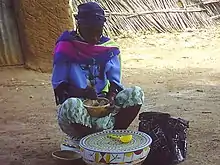 The millet is first washed, then the peels are removed. It is dried and ground. Dried ginger, cloves, and chili pepper are ground together and added to the powdered millet. Salt is added to the mixture before it is poured into a mortar and pounded while water is sprinkled gradually to form a dough.[12] This is then molded into the desired shapes. The dough can also be poured into a bowl and covered with a leaf overnight for it to ferment. The balls are cooked in a pot, then pounded, and sprinkled with water again. The dough is pounded until it becomes very soft. The paste can then be shaped into balls.[13] It is be dusted with millet or corn flour to prevent the fura from sticking together.[11]