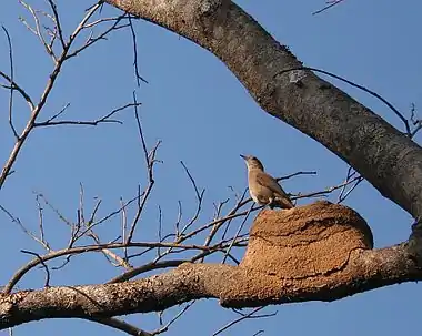 Adult horneros can frequently be seen sitting on top of their nest. Except for the uncommon and relatively shy bay hornero, horneros are typically fairly common and highly conspicuous birds. They are generally noisy. All horneros are partially terrestrial, and commonly seen walking on the ground with a relatively upright posture.