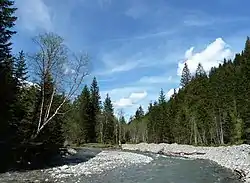 The Fuscher Ache rises as the confluence of the Kaefertalbach und the Traunerbach near the Fuscher Törl at a height of about 2,500 m (AA) in the Lower Pinzgau. It flows from south to north through the valley of the same name, passing the small village of Fusch an der Großglocknerstraße. It supplies a drinking water reservoir for the village, its water quality being very high. It is rich in fish such as brown trout, grayling and char. After about 28 km (17 mi) it empties into the Salzach at Bruck an der Großglocknerstraße.[1]