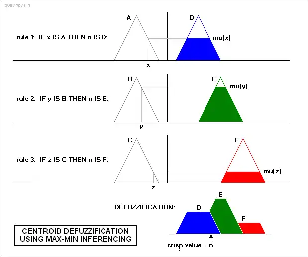 The diagram below demonstrates max-min inferencing and centroid defuzzification for a system with input variables "x", "y", and "z" and an output variable "n". Note that "mu" is standard fuzzy-logic nomenclature for "truth value":