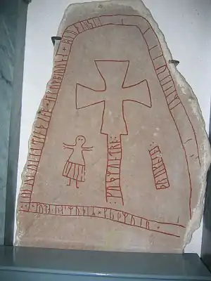 Of the personal names listed in the inscription, Guðbjôrn means "God's Bear" and Guðmundr means "God's Hand."[2] The use of the common name element Guð in the two names would indicate that they were members of the same family, although the runic text, which is damaged and incomplete, does not directly state this. A common practice at that time in Scandinavia was the repeating one of the name elements from a parent's name in the names of the children to show the family connection.[3]