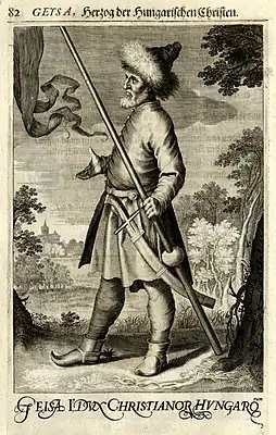 Géza was the elder son of Taksony, Grand Prince of the Hungarians.[1] His mother was his father's wife "from the land of the Cumans",[2] according to the anonymous author of the Gesta Hungarorum.[3] This anachronistic reference to the Cumans suggests that she was of Khazar, Pecheneg or Volga Bulgarian origin.[4] The Byzantine Emperor Constantine VII Porphyrogenitus, who listed the descendants of Grand Prince Árpád around 950, did not mention Géza.[4] Even so, Gyula Kristó wrote that Géza was born around 940 and the emperor ignored him because of his youth.[4] The genuine form of his name was either "Gyeücsa" or "Gyeusa", which is possibly a diminutive form of the Turkic title yabgu.[4] Géza's father arranged his marriage with Sarolt—a daughter of a Hungarian chieftain called Gyula, [4][5] who ruled Transylvania independently of the grand prince[5] and had converted to Christianity in Constantinople.[6] Sarolt seems to have also adhered to Eastern Orthodox Christianity, according to Bruno of Querfurt's remark on her "languid and muddled Christianity".[6]