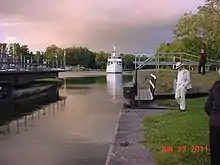 These days the canal is primarily used as a tourist and recreational attraction. Around two million people visit the canal each year on pleasure cruises - either on their own boats or on one of the many cruise ships - and related activities.[2] The canal sometimes is ironically called the "divorce ditch" (Swedish: skilsmässodiket) because of the troubles that inexperienced couples have to endure while trying to navigate the narrow canal and the many locks by themselves.[13][14][15]