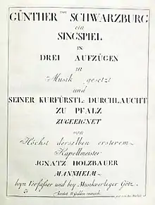 Günther von Schwarzburg is a Singspiel in three acts by Ignaz Holzbauer set to a German libretto by Anton Klein. Loosely based on events in the life of the 14th-century German king, Günther von Schwarzburg, the opera premiered on 5 January 1777 at the Hoftheater in the Mannheim Palace.