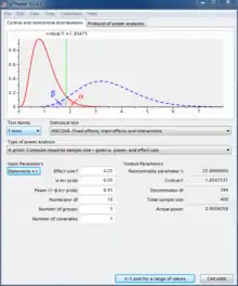 G*Power is a free-to use software used to calculate statistical power. The program offers the ability to calculate power for a wide variety of statistical tests including t-tests, F-tests, and chi-square-tests, among others. Additionally, the user must determine which of the many contexts this test is being used, such as a one-way ANOVA versus a multi-way ANOVA. In order to calculate power, the user must know four of five variables: either number of groups, number of observations, effect size, significance level (α), or power (1-β). G*Power has a built-in tool for determining effect size if it cannot be estimated from prior literature or is not easily calculable.