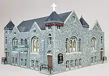 So popular was his preaching that G. E. Lowman founded the Baltimore Gospel Tabernacle in 1930, building a large Romanesque Revival-style stone church at the corner of Federal and Wolfe Streets, in an east Baltimore neighborhood near Johns Hopkins Hospital.[7] A Lutheran church and later a Mormon congregation had previously occupied a portion of the site since 1893, and the newly constructed Baltimore Gospel Tabernacle incorporated the former structure in its design, more than tripling the building's overall size. When completed, the building had a seating capacity of 500 persons at a cost of $45,000 (approximately $735,000 in 2021 dollars).[8] Several large stained glass windows were installed in the new edifice, one of which was donated by a Titanic survivor.[9] Atop the Tabernacle's west tower was an illuminated cross, which revolved when services were underway, one of four revolving crosses in existence in the U.S. at the time.[10]