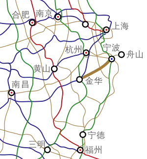 The Ningbo–Jinhua Expressway (Chinese: 宁波—金华高速公路), commonly referred to as the Yongjin Expressway (Chinese: 甬金高速公路) is a 185.56-kilometre-long expressway (115.30 mi)[1] that connects the cities of Ningbo and Jinhua in the Chinese province of Zhejiang. The expressway is an auxiliary route of G15 Shenyang–Haikou Expressway. This expressway was opened in December 28 2005.[2]