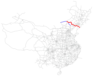 The Dandong–Xilinhot Expressway (Chinese: 丹东—锡林浩特高速公路), designated as G16 and commonly referred to as the Danxi Expressway (Chinese: 丹锡高速公路) is an expressway that connects the cities of Dandong, Liaoning, China, and Xilinhot, Inner Mongolia. When fully complete, it will be 960 km (600 mi) in length.