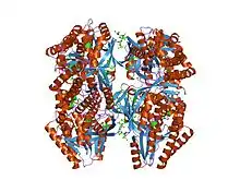 In molecular biology, the GHMP kinase family is a family of kinase enzymes. Members of this family include homoserine kinases EC 2.7.1.39, galactokinases EC 2.7.1.6, and mevalonate kinasesEC 2.7.1.36. These kinases make up the GHMP kinase superfamily of ATP-dependent enzymes.[1] These enzymes are involved in the biosynthesis of isoprenes and amino acids as well as in carbohydrate metabolism. These enzymes contain, in their N-terminal section, a conserved Gly/Ser-rich region which is probably involved in the binding of ATP.[2][3] The C-terminal domain of homoserine kinase has a central alpha-beta plait fold and an insertion of four helices, which, together with the N-terminal fold, creates a novel nucleotide binding fold.[4]