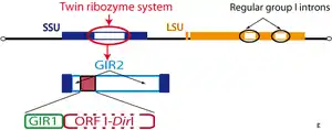The twin-ribozyme introns represent some of the most complex organized group I introns known and consist of a homing endonuclease gene (HEG: I-DirI homing endonuclease) embedded in two functionally distinct catalytic RNA domains. One of the catalytic RNAs is a conventional group I intron ribozyme (GIR2) responsible for the intron splicing and reverse splicing, as well as intron RNA circularization. The other catalytic RNA domain is the group I-like ribozyme (GIR1) directly involved in homing endonuclease mRNA maturation.