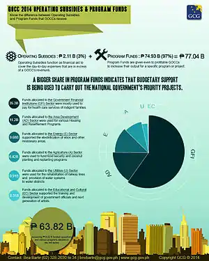 Subsidies from the National Government in 2011 amounted to 21 billion Philippine pesos.[7] In the 2013 fiscal year, the national government gave P71.9 billion pesos to GOCCs in subsidies, nearly twice the 44.7 billion pesos that was programmed in the budget.[2] In 2014, 77.04 billion pesos was spent on GOCCs by the national government, 3% of which was classified as subsidies and 97% was classified as program funds.[6]